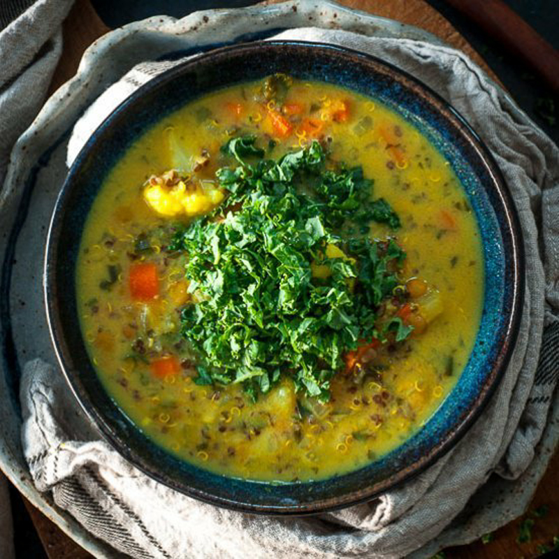 - Add in the quinoa flour and the chicken broth. Allow to come to a boil. Lower the heat to low and cover. Cook for 20 minutes or until the quinoa is cooked through.