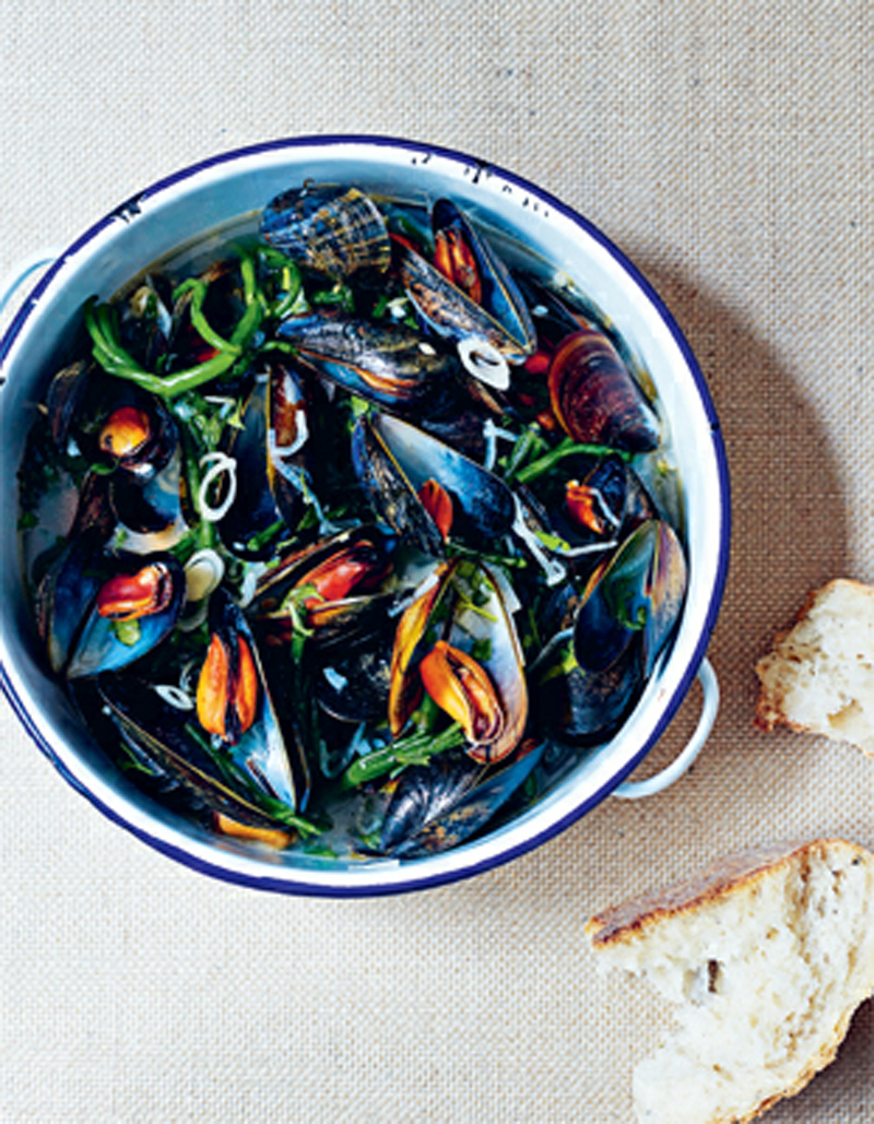 This is a shameless twist on a French staple, leaving out the conventional aromatics of thyme and bay and replacing them, perhaps brazenly, with a lemon grass stalk or two. As the cooking liquor has been increased in volume to make this more soupy than the classic moules marinières, a good fish stock is important; follow my recipe for fish stock and make your own fresh, if you can.