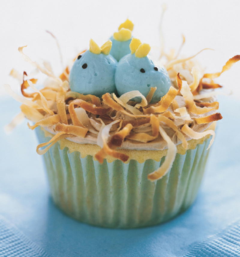 - To finish, form each nest with 2 tablespoons toasted coconut, patting it into frosting around edge of cupcake with your fingertips.