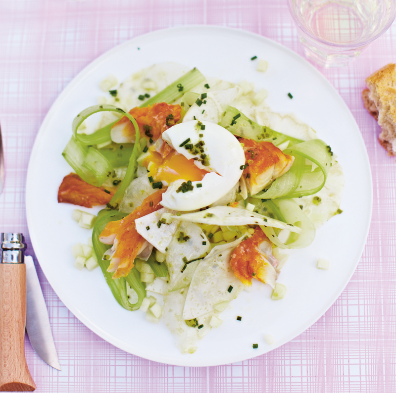 - Remove the fish from the milk with a slotted spoon. Peel off the skin and use a fork to flake the flesh into the bowl with the salad. Gently mix together the fish and salad before dividing between four serving plates and placing an egg on top of each salad. Drizzle with some of the poaching milk before serving.