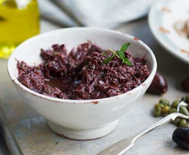 - Cover the goat cheese with the tapenade and top with the pecans.