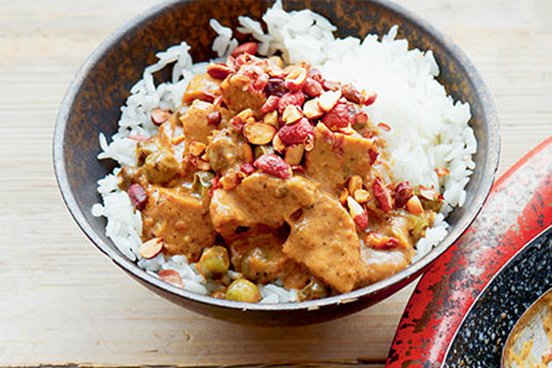 This recipe uses the fragrant chicken-like seitan recipe but you could use any ready-made vegan chicken pieces. Simply add the bite-sized pieces into the rich curry sauce. You could also use ready-made canned seitan from a Chinese supermarket. Ensure the pieces are well rinsed in warm water and dried before using, or the flavour of the brine will dominate the sauce. Simply use your hands to tear the pieces into the curry during the last few minutes of simmering.