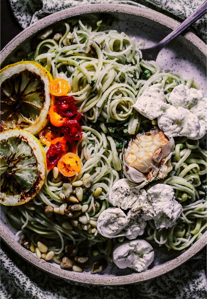 - Transfer the pesto to a small bowl and stir in the olive oil to moisten. Season with ½ tsp salt and serve right away or refrigerate until needed, for up to 5 days. Cook the pasta according to the package directions, reserving 1 cup [240 ml] of the cooking water. Remove from the heat, drain the pasta, and return it to the pot. Toss the hot pasta with the pesto, using as much or as little as you like. Add the reserved cooking water, a little at a time, to moisten the mixture, if needed. Serve the pasta family style or in individual portions, garnished with extra cheese, walnuts, pine nuts, a drizzle of olive oil, and anything else that strikes your fancy.