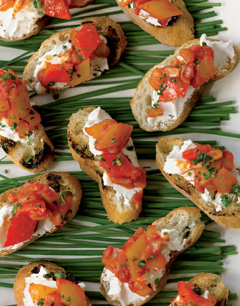 - I like to squish the goat cheese into a serving bowl and nestle the peperonata in the center rather than spooning it over an entire log—it’s more rustic-looking this way. Garnish with chives if you like and serve with baguette slices.