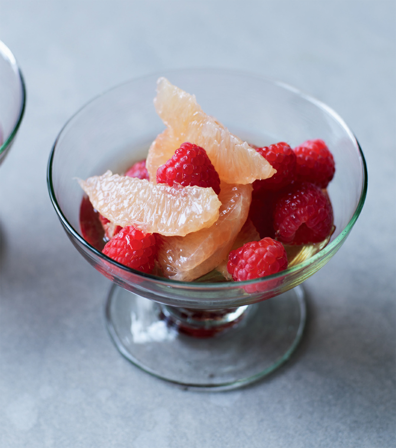 Pink grapefruit and raspberries in a light cinnamon syrup recipe
