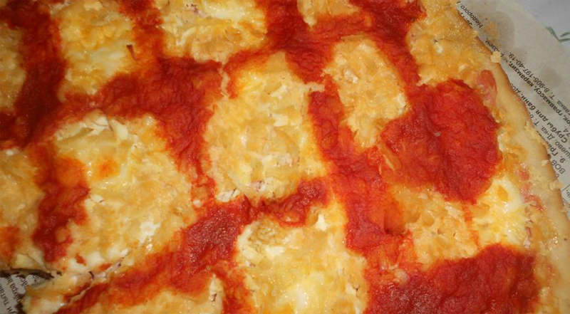 - Divide the dough into 2 parts, roll in circles. Roll out the dough with ketchup, put a layer of onions, then chicken, grease with mayonnaise.Then put a layer of grated cheese and make a "mesh" of ketchup.
