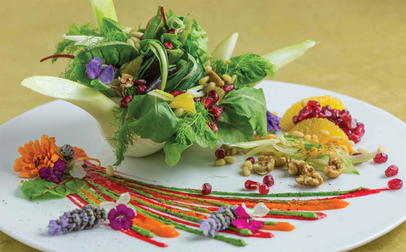 - Combine fennel, mesclun greens, oranges, pear, and pomegranates in a large salad bowl.