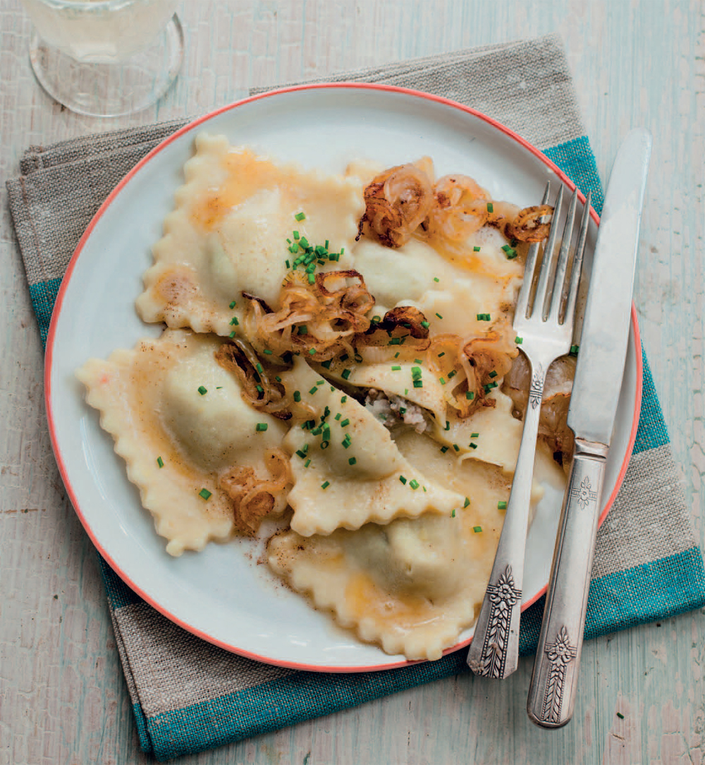 - Cook the potato ravioli for about 5 minutes in lightly boiling salted water. Melt 2–3 tablespoons butter in a large, heavy frying pan and allow to brown. Remove the ravioli with a slotted spoon and allow to thoroughly dry before coating in the browned butter. Arrange on plates and sprinkle with the remaining chives before serving.