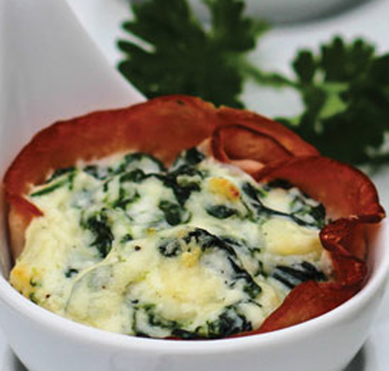 - Spoon an even amount of mixture into each ham cup. Top with remaining mozzarella.