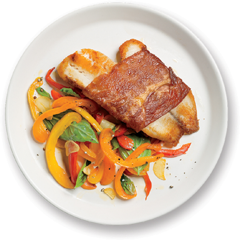 - Season the tilapia with ¼ teaspoon each salt and black pepper. Wrap each fillet in a slice of prosciutto. Cook in the remaining 1½ tablespoons of oil in a nonstick skillet over medium-high heat until cooked through, 2 to 3 minutes per side. Serve with the bell peppers.