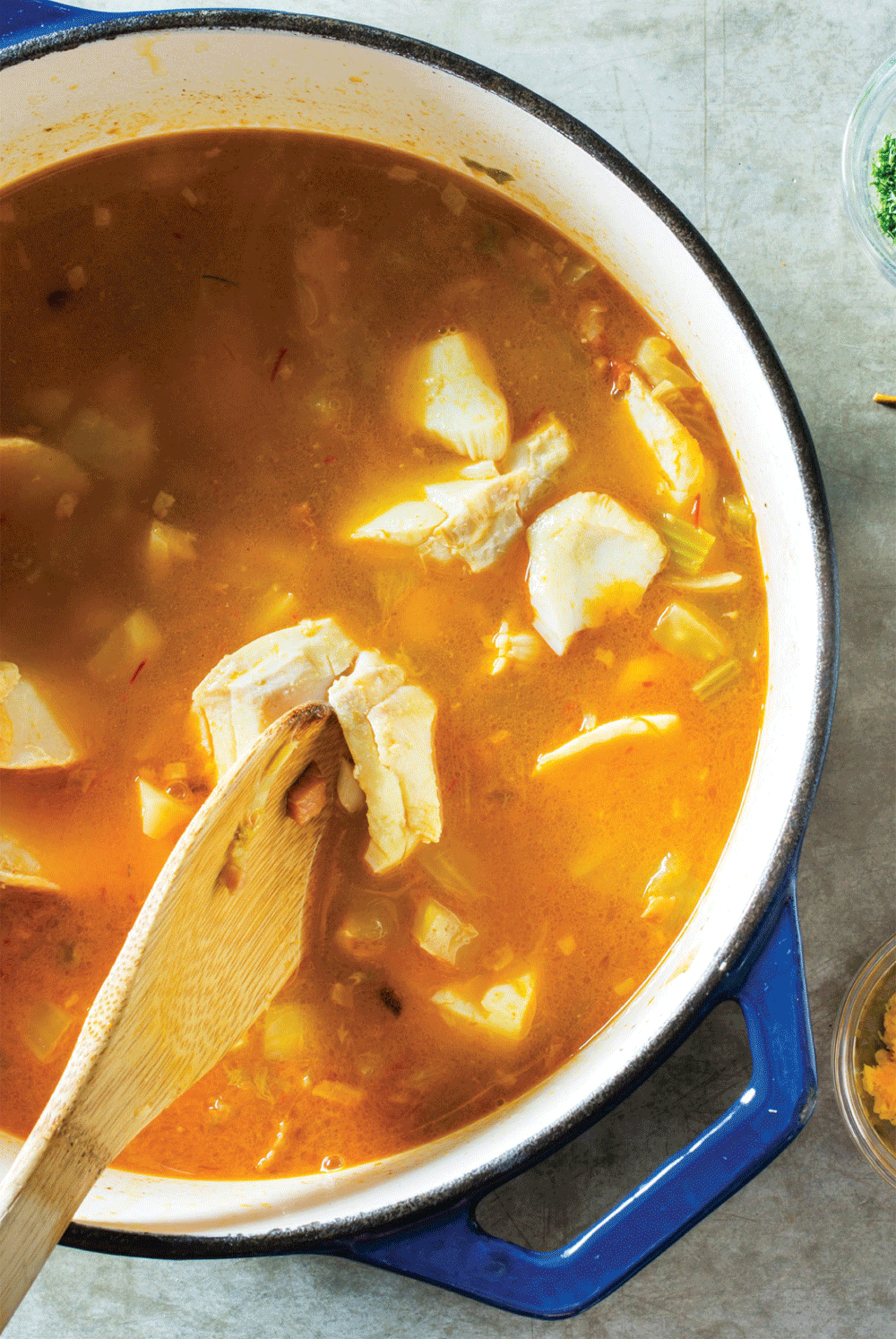 Every country with a coastline boasts its own version of fish soup; our Provence-inspired version is not only easy to make, it also boasts a richly flavored broth fragranced with fennel, paprika, saffron, and orange zest. We chose thick cod fillets, wanting a firm fish that would not break apart too easily. The problem then came in building the soup base. Initial tests with premade fish stock produced soups that overpowered the fish’s own mild flavor. To cook the fish perfectly, we left it in big slices so that they wouldn’t break apart too much. We tried simmering the fish over low heat, but when we employed direct heat, the fish was overcooked by the time it was served. We decided on a more unconventional method: We placed the fish in the pot, shut off the heat, and let it poach gently. This technique was undeniably successful and the fish was perfectly cooked. Finally, we had a hearty, fragrant fish soup with perfect broth and perfect fish. This method lends itself well to making ahead, as all the work is in building a flavorful broth, which can be done ahead of time. Halibut can be substituted for the cod.