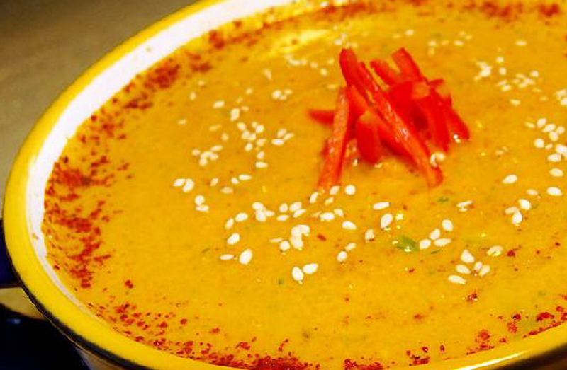 - Sprinkle with black sesame seeds, fresh coriander and finely diced red bell pepper.