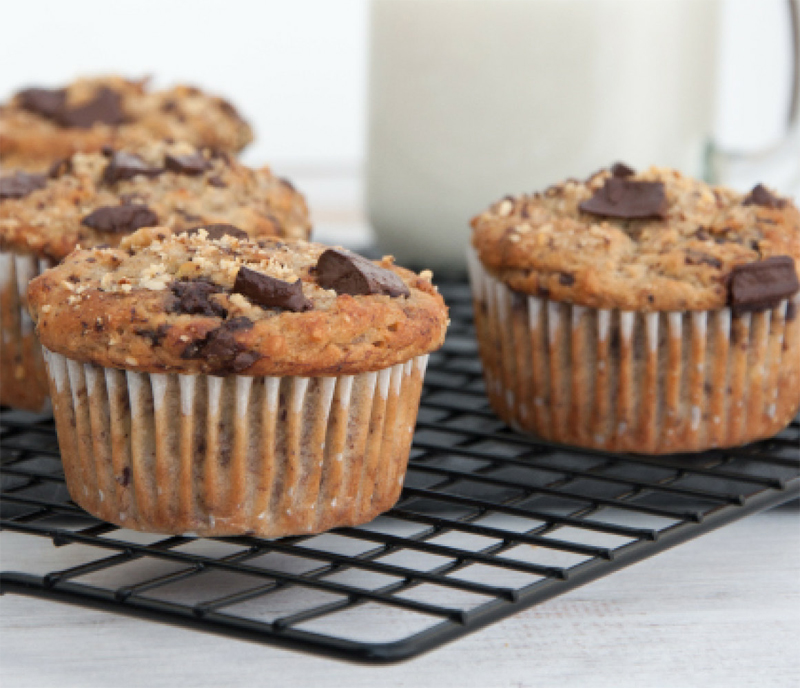 - Scoop the batter into a muffin pan lined with muffin papers or silicone forms. The batter should be enough for 8 muffins. Divide the rest of the chocolate chunks among the muffins.