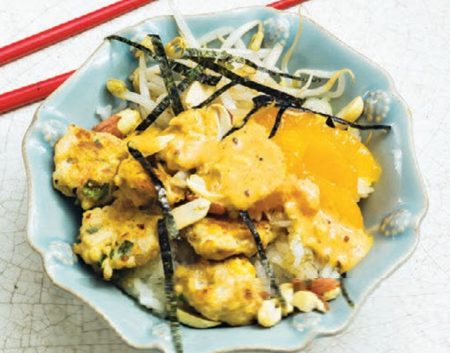 - To serve, scoop the rice into your rice bowls. Place 2 or 3 chicken patties over the rice in each bowl. Place a few orange segments next to the chicken. Spoon about a tablespoon of the miso rémoulade over the chicken. Scatter a few bean sprouts over the sauce and sprinkle with a small amount of crushed peanuts and a pinch of nori matchsticks. Serve immediately with spoons. It is best to mix everything together before enjoying.