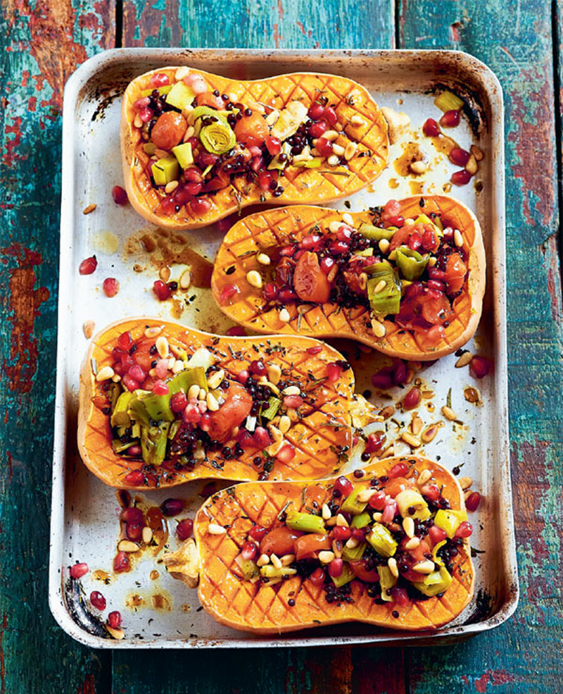 - Scatter with salt flakes and freshly ground black pepper and return to the oven for another 20 minutes, until the flesh of the squash is soft and the leeks and tomatoes are lightly charred. Scoop the leeks and tomatoes into a large bowl. Drain and rinse the lentils, and add them to the bowl. Mix the olive oil and pomegranate molasses together for the dressing and add about half to the lentil mixture. Pile the mixture into the squash hollows and return the sheet pan to the oven. Bake for 5 minutes, until the lentil filling is just heated through.