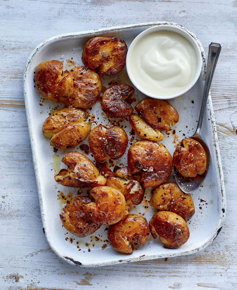 - Remove the potatoes from the oven and use a potato masher or fork to crush each one just enough so that the skin breaks in a few places. Drizzle with a little extra oil, then return to the oven and bake for another 20 minutes. Serve hot and crispy, with the aioli on the side.