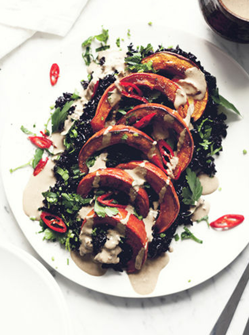- To serve, arrange the rice and pumpkin slices on each plate. Sprinkle with cracked black pepper, the chopped parsley, the chile, and the raisins if using. Drizzle with the tangerine tahini sauce. Serve extra sauce on the side.