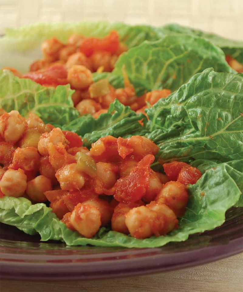 - Spoon chickpeas into lettuce leaves and top with chopped bell pepper pieces.