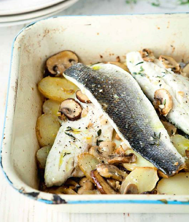 - Rub the skin of the sea bass fillets with olive oil, then season them with salt and pepper. Place the fillets on top of the mushrooms and potatoes, skin-side up, and put the tin back in the oven. Roast for 8–10 minutes, depending on the thickness of the fillets, until the fish is just cooked through. Serve immediately.