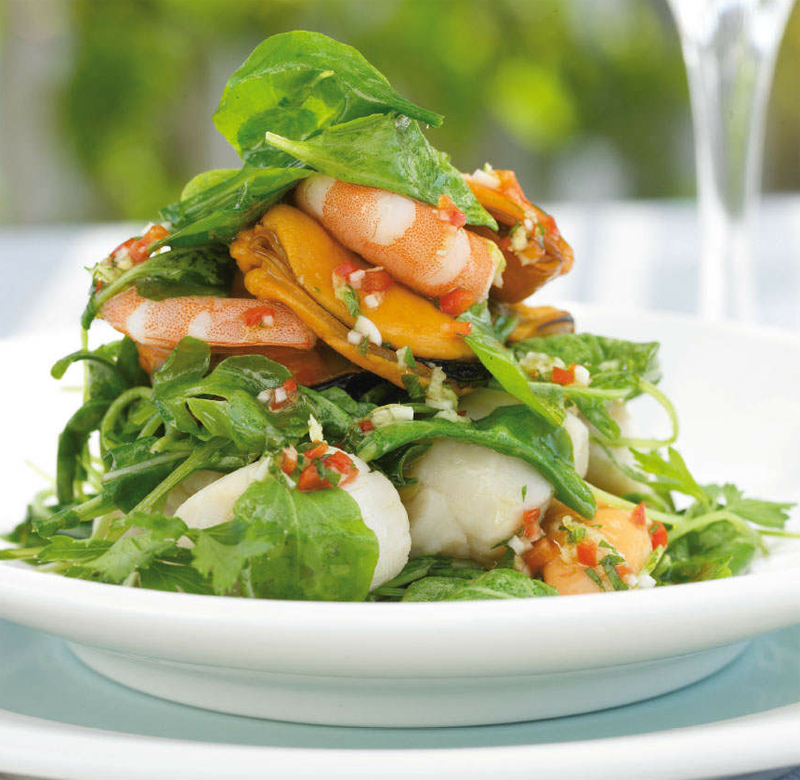 - To make the dressing, put all the ingredients into a small bowl and mix. Arrange the spinach on serving dishes, then scatter over half of the scallions. Top with the mussels, shrimp and scallops, then scatter over the remaining scallions. Drizzle over the dressing and serve.