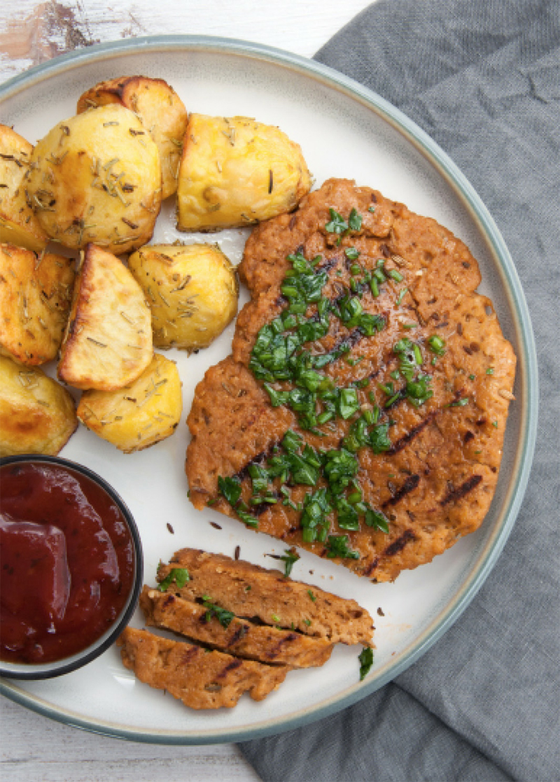 Not unlike meat, seitan can develop every texture from soft and juicy to firm and chewy. This makes seitan an amazing alternative to any meat, which is why in this recipe, we tried our hands at the main event of the meats. By adding sparkling water to the mix, our seitan is softer than many tough store-bought seitan cutlets. It goes perfectly with potatoes, but you can also cut this steak in strips, roast it with some soy sauce, and add it to a sandwich.