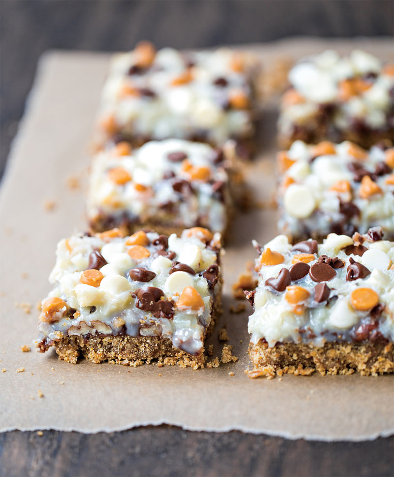 - Meanwhile, in a small saucepan, melt ½ cup of the chocolate chips and the remaining 2 tablespoons butter over medium-low heat. Stir in ⅓ cup of the condensed milk. Drizzle the chocolate sauce over the warm pretzel crust immediately and gently smooth it with a rubber spatula. Sprinkle the chopped walnuts over the top and drizzle with the remaining condensed milk. Finally, sprinkle the coconut, remaining ¼ cup chocolate chips, white chocolate chips, and butterscotch chips (if using) on top.