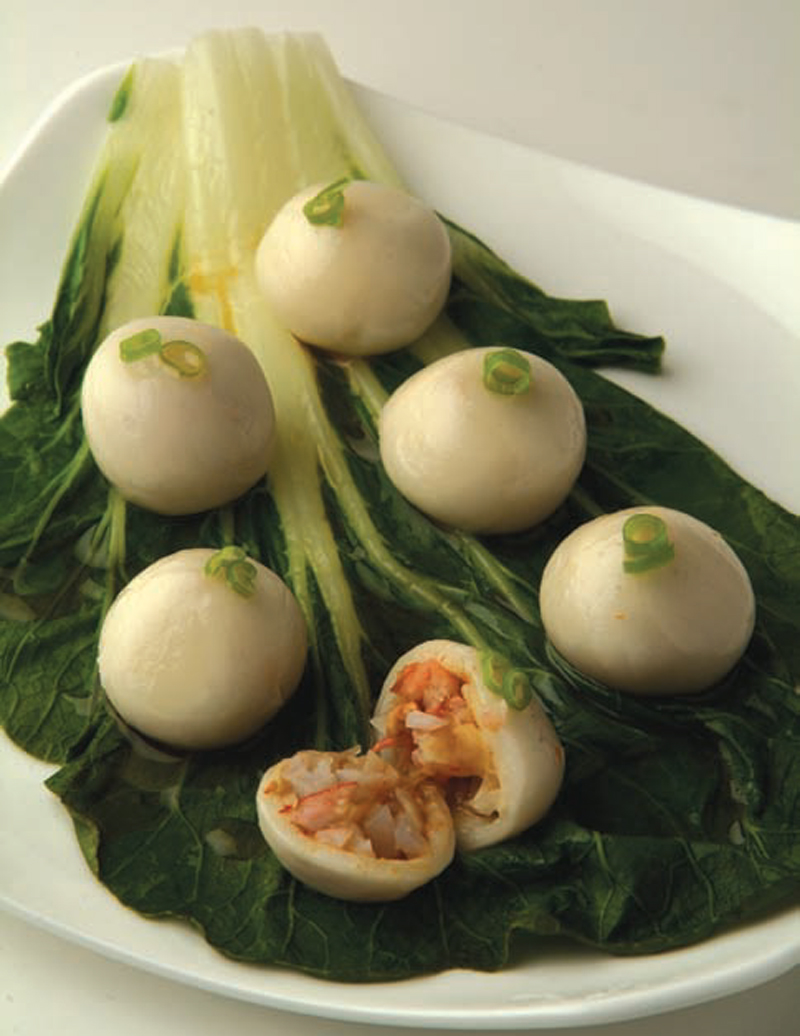 - When you are ready to cook the rolls, place them inside the steamer setup and steam for 8–10 minutes to cook them throughout (the shrimp should be pink, and the dough should become firm). Serve with 1 tsp of soy sauce and 1 tsp of peanut oil drizzled over each roll on a serving plate, topped with the green onion slivers.