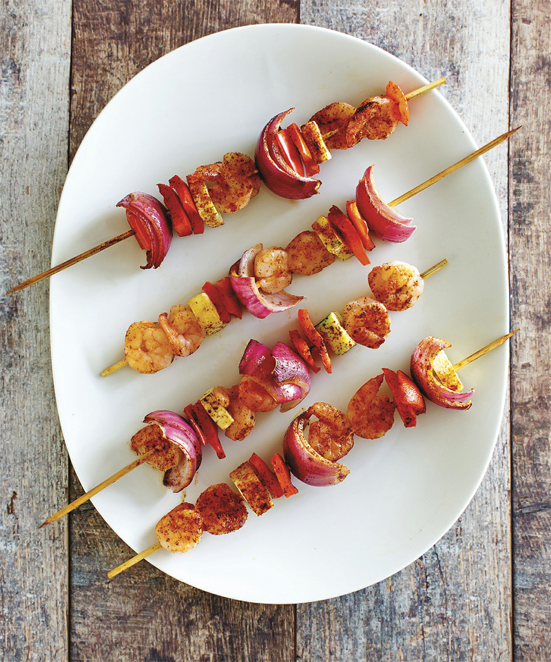 - Soak four 6" bamboo skewers in water for 30 minutes. Place a shrimp on the skewer, then a zucchini, a pepper, and an onion. Repeat until all ingredients are utilized.