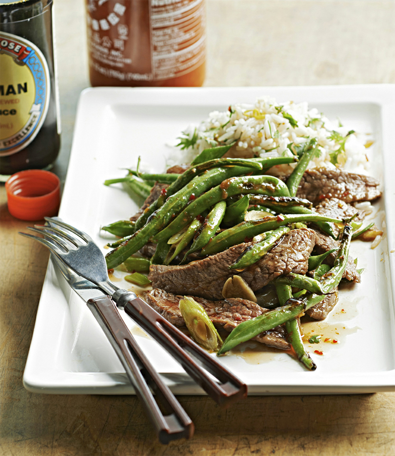 - Trim and halve green beans on the diagonal; set aside. Cut flank steak across the grain into thin slices; set aside. In a small bowl combine garlic and ginger; set aside. In another small bowl combine soy sauce and brown sugar; set aside.