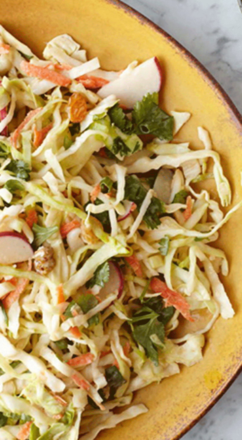- To the bowl, add the cabbage, carrot, radishes, scallions, cilantro, and raisins. Toss well to coat everything with the dressing. Refrigerate until chilled and toss again before serving.