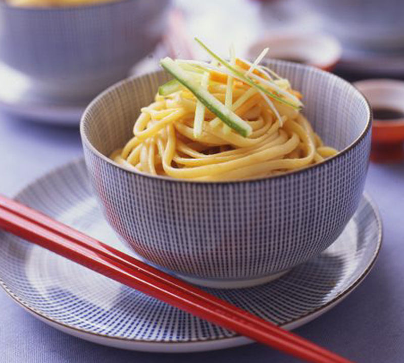 - Place the noodles in a large shallow serving bowl. Arrange the carrots, cucumber, and scallions decoratively in little piles around the rim of the dish. Sprinkle with the cilantro and serve.