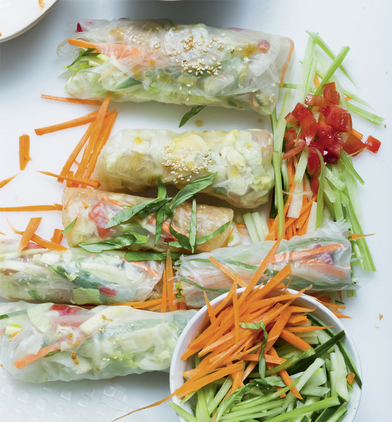 4. Fill a wide shallow bowl with water. Put the rice paper wrappers very briefly in the water then place them on a cutting board. Immediately spread the vegetables of your choice on each wrapper, and sprinkle sesame seeds over the top, leaving the edges free. Fold the two sides of each wrapper over the filling, and roll up the wrapper from the bottom. Just before you finish rolling, moisten your finger again, run it over all the edges, then “glue” your wrap shut.