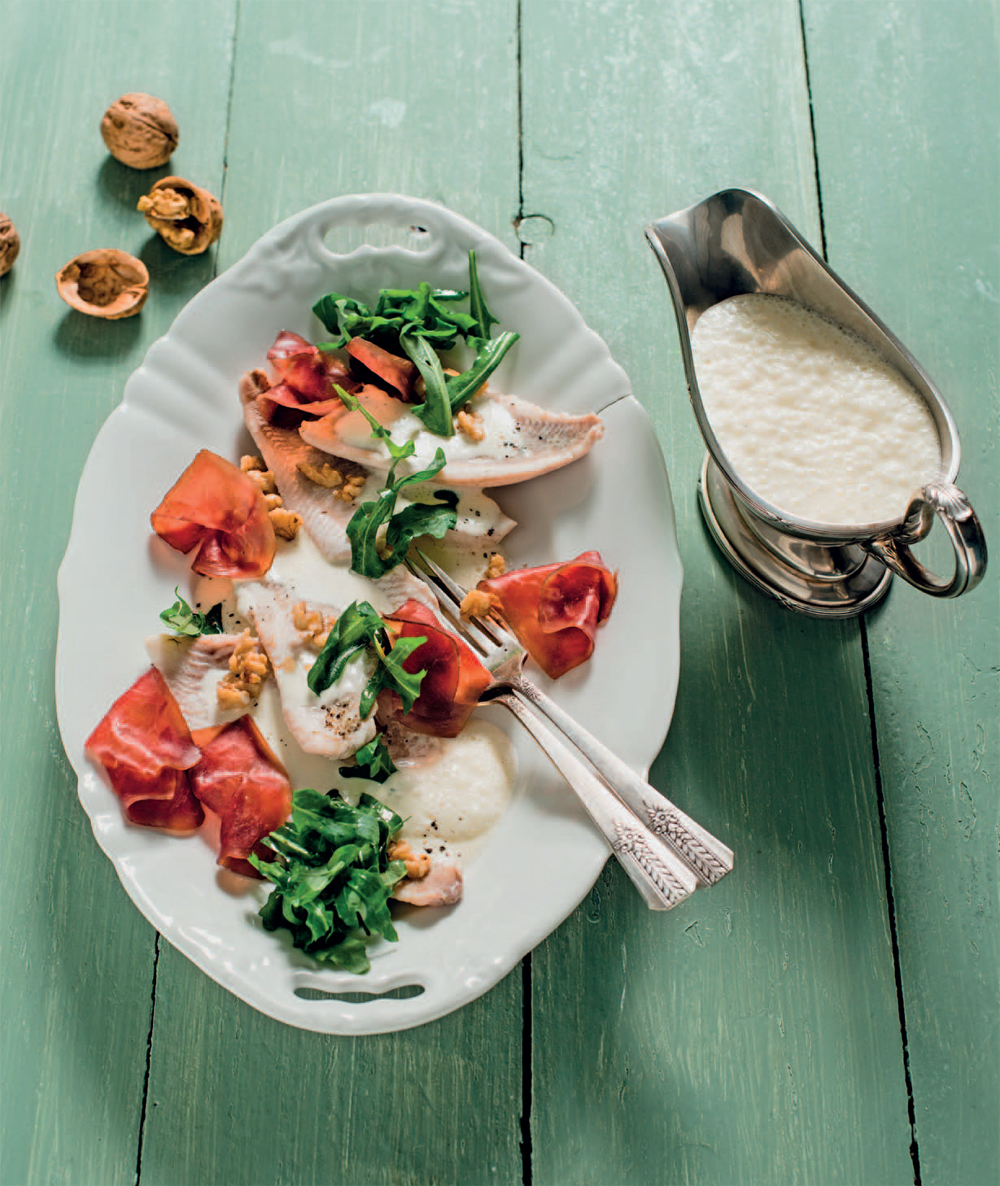 - Mix the steaming liquid with the crème fraîche and cook for 2–3 minutes until creamy. In the meantime, mix the arugula with the walnut oil and lightly season with salt. Season the sauce with salt, as well, and froth the sauce using an immersion blender. Plate the perch fillets with the sauce. Divide the Bündnerfleisch among the perch fillets and sprinkle with the arugula and roasted walnuts. Goes well with polenta, mashed potatoes, or boiled potatoes.