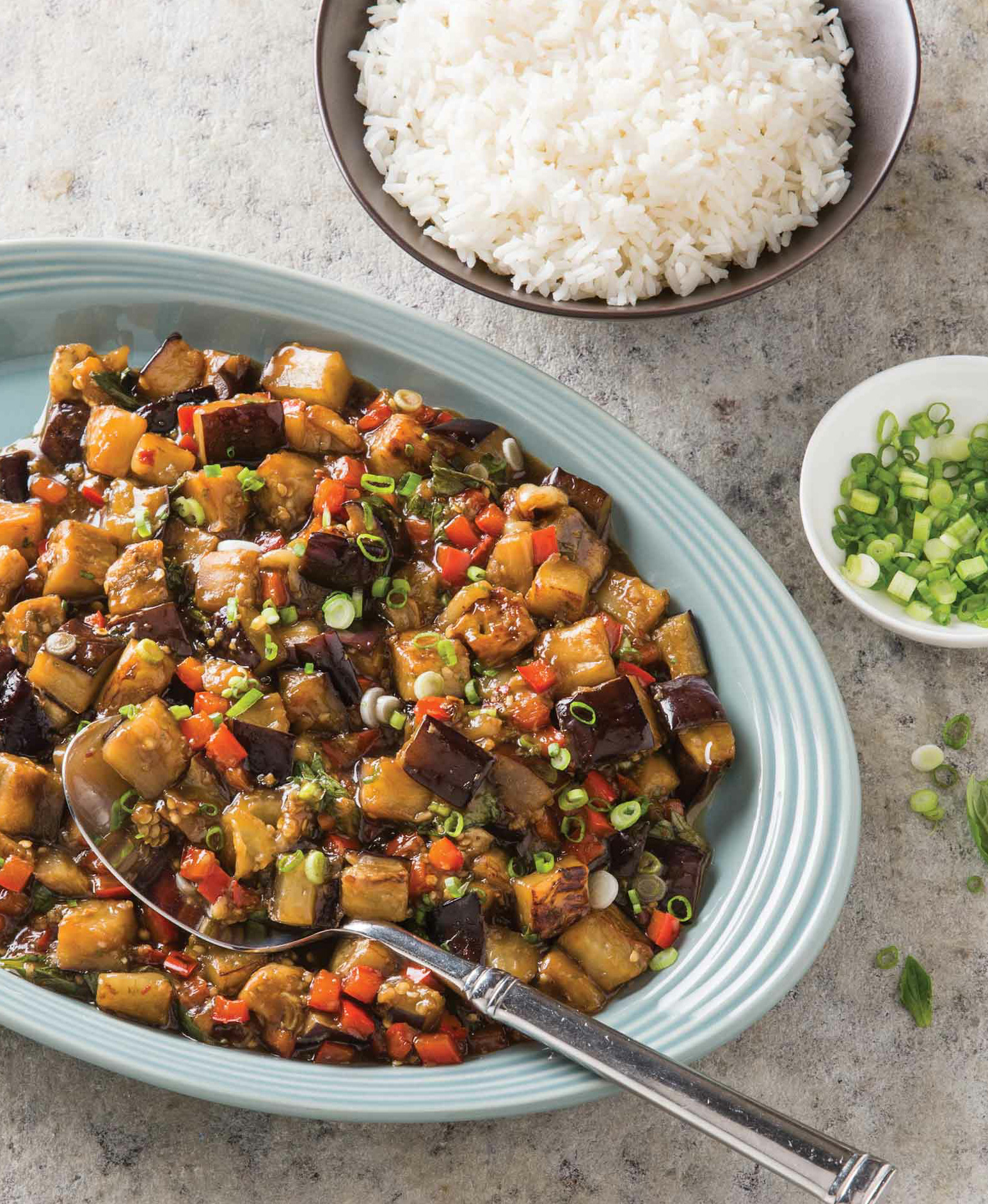 We love the versatility of eggplant, but its one downfall is that its flesh acts like a sponge, absorbing copious amounts of oil during cooking. We wanted an Asian-inspired stir-fry that starred eggplant but wasn’t weighed down by excessive oil, yet still boasted plenty of flavor. We started by mixing our sauce ingredients, allowing the bright lime zest, savory fish sauce, and spicy pepper flakes to meld together. We used just 2 tablespoons of heart-healthy canola oil and sautéed the eggplant (purposefully leaving the skin on for extra fiber and phytonutrients) with a vitamin C–rich red bell pepper until both softened, letting them brown and take on a deeper, caramelized flavor. We then added the garlic and ginger to the center of the skillet, and let them become fragrant before briefly mingling them with the vegetables. We poured our sauce into the stir-fry and added a final sprinkle of basil and scallions to lend a fresh sweetness to the dish before serving. Do not peel the eggplant: In addition to adding nutrients, leaving the skin on helps it hold together during cooking. Serve with brown rice.