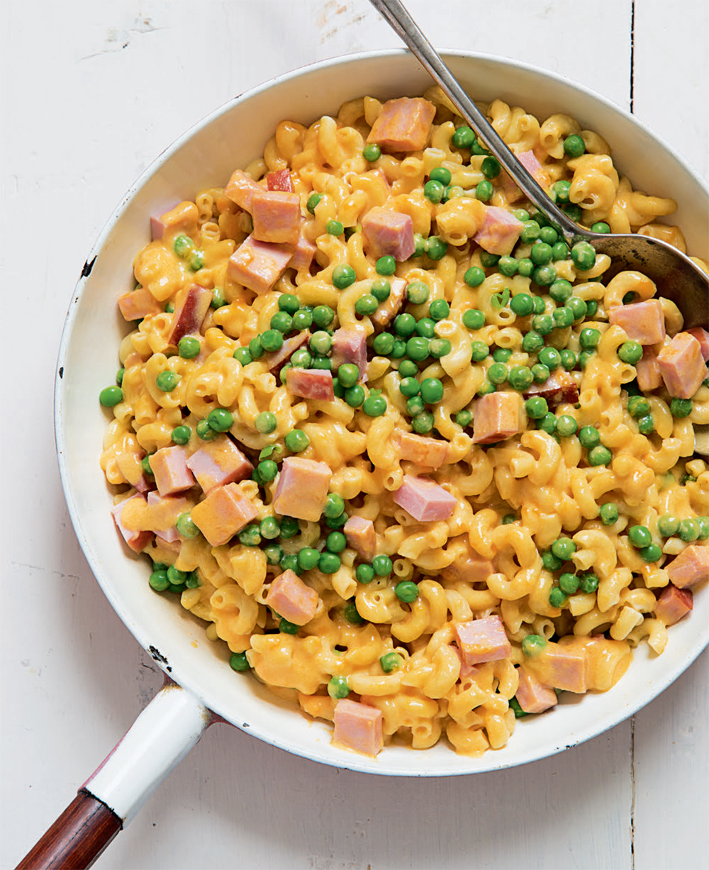 Whether you make it in a skillet or pasta pot, this is such an easy, fast recipe, it deserves its place in a book devoted to one-dish meals. This is one of the best ways to use leftover ham. But if you don’t have the ham, or the peas for that matter, the dish is still worth considering, because this macaroni and cheese is as quick to make as the boxed kind, but so much better in flavor.