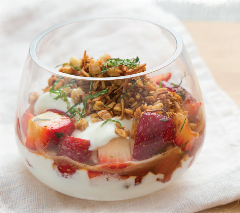 6. To serve, divide the yoghurt among serving glasses. Top with the strawberries, then the nut crumble and lemon verbena or mint.