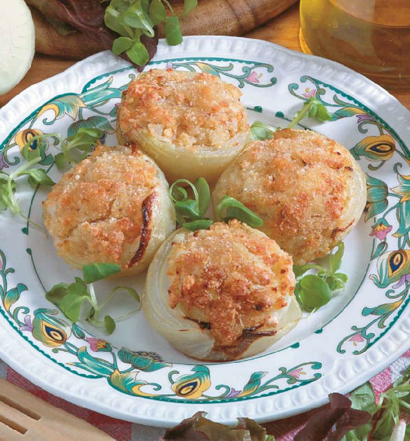 - Stuff the onion shells with the cheese mixture, and arrange in a baking dish. Sprinkle the top with breadcrumbs, drizzle with olive oil, and place in a preheated 400° oven. Bake for about 15 minutes. Serve warm.
