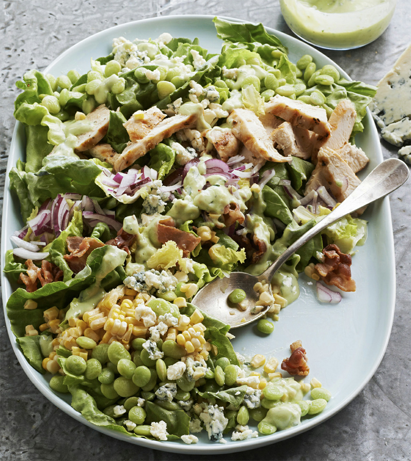 There are many versions of succotash that most Southern of summer side dishes. Some are simply lima beans and corn and others include chopped sweet pepper as well. This hearty salad expands on that theme with butterhead lettuce, blue cheese, chicken, and bacon. Lima beans have a very short growing season and are very seldom available fresh. If you can find them, by all means use them. Otherwise, frozen lima beans like frozen peas are very high quality.