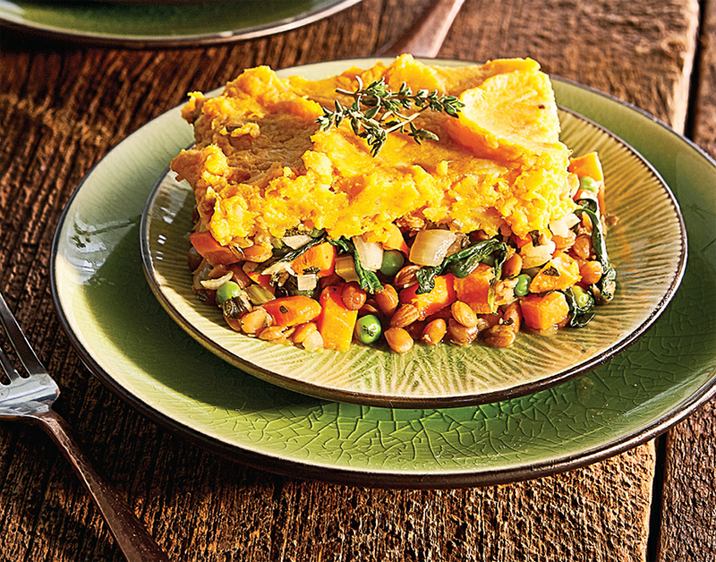 5. Transfer the mixture to a 13-by-9-inch baking dish. Top with the reserved sweet potato/cauliflower. Score the top with a fork and bake for 30 minutes.