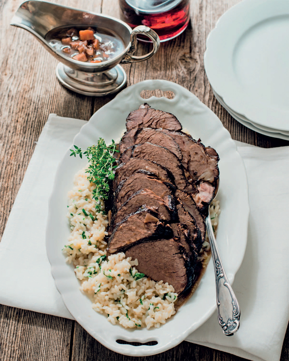 Suure Mocke, the Swiss version of Sauerbraten, is classically served with mashed potatoes, polenta, or cheese noodles, but it also goes well with a simple risotto.