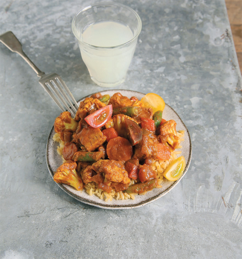 - Add the cauliflower, green beans, carrots, and bell pepper, the remaining 1¾ cups (415 ml) broth, and tomato paste. Bring to a boil, and then reduce the heat to a simmer. Cook for 25 to 30 minutes, stirring occasionally, until the vegetables are the desired tenderness. Add the tempeh back to the skillet and stir to combine. Simmer for 5 minutes. Taste and adjust the seasonings. Garnish with tomato and cilantro.