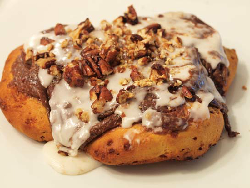 5. Remove from oven and cool for 5–10 minutes. Once cool to the touch, gently spread desired amount of icing from container on top of cream cheese spread. Crush caramelized pecans on top, if desired. Serve warm.