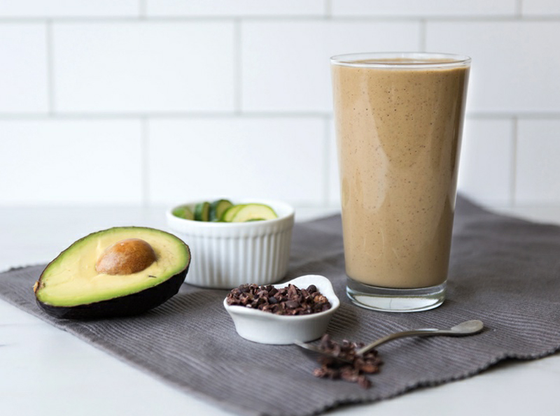 - Combine zucchini, banana, avocado, almond butter, cacao powder, cacao nibs, protein blend, ice cubes and almond milk in a Nutribullet and process until smooth.