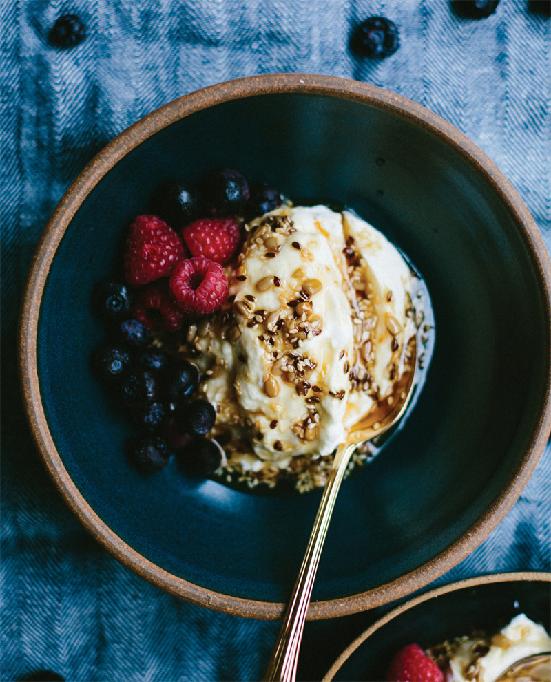 Plain yogurt is a stand-in for sour cream in savory dishes and baked goods and perfect for a quick, hearty breakfast. This seedy honey adds a bit of heft along with a sweet and fun crunch, sort of like sprinkles sort of. Served with fresh berries this is a standard for quick weekday breakfasts. The seedy honey can be made well in advance and stored at room temperature, just as you would plain honey.
