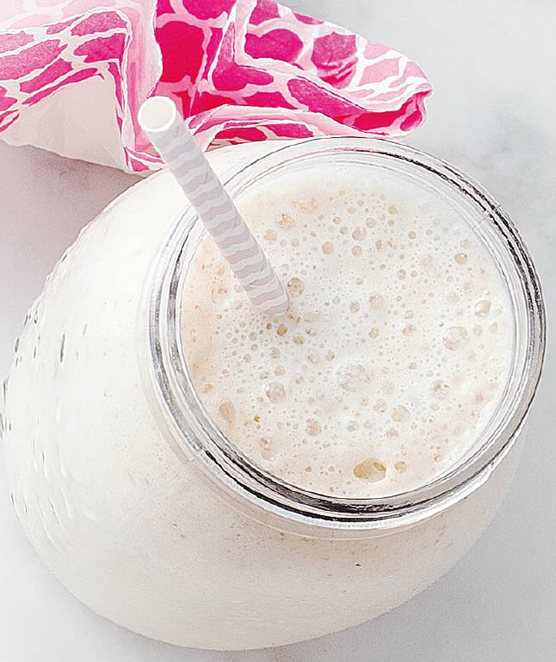 2. Place the dates, apple sauce, maple syrup, cinnamon, milk, yoghurt and ice cubes in a high-powered blender and blend until smooth.