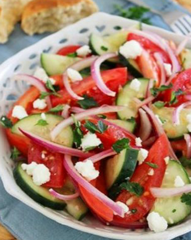 2. Toss together tomatoes, cucumber, onion, and parsley in a large bowl. Drizzle dressing over and toss to coat. Divide salad evenly among 6 plates. Sprinkle evenly with goat cheese.