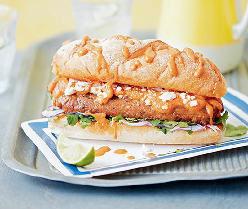 11. Slice the sub rolls lengthways and brush generously with the hot sauce, then place on the hot griddle/grill pan. Toast for a few minutes, then put onto plates. Top the rolls with the sausages, crumbled vegan feta or ricotta, onion, coriander/cilantro and a splash of lime juice if you like. Drizzle all over with more hot sauce and serve with napkins!