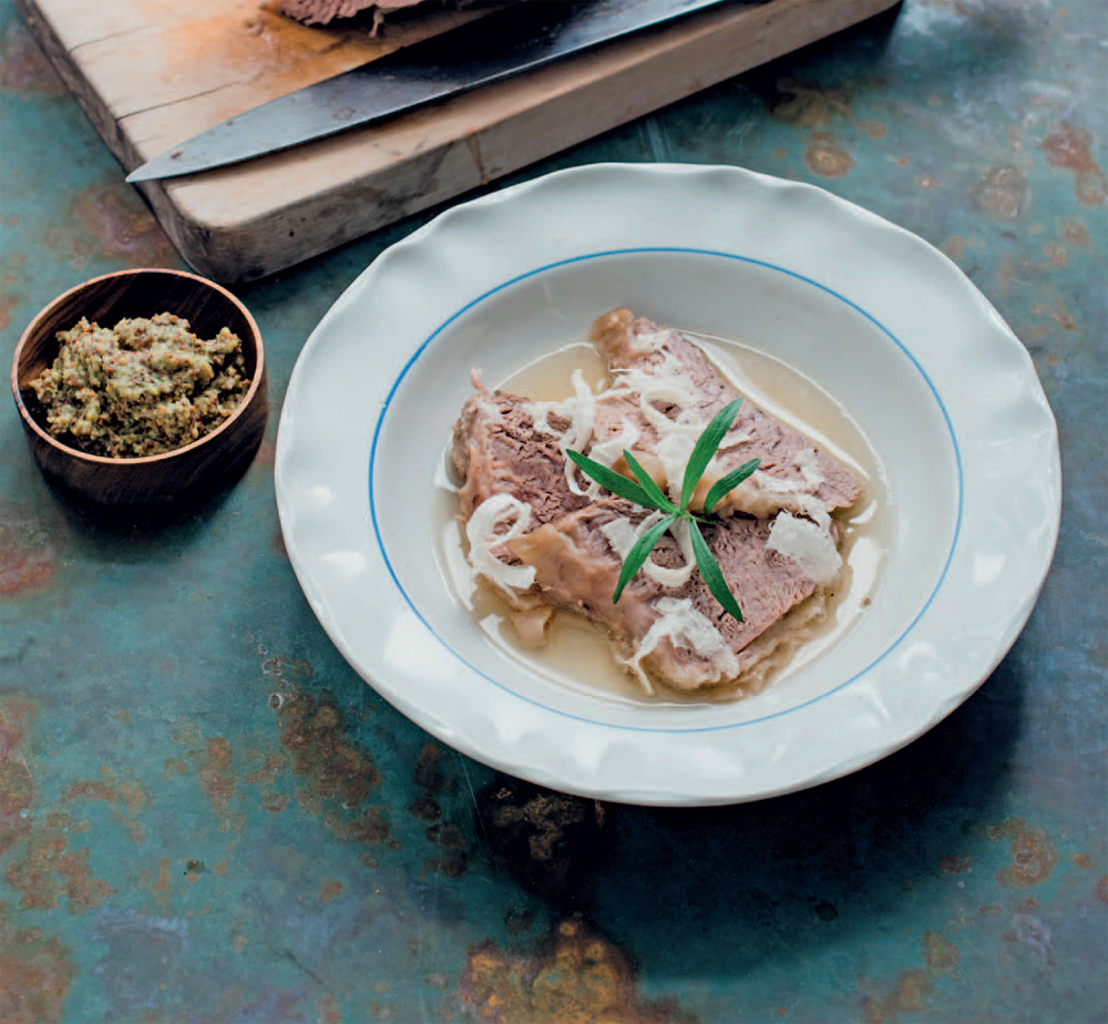 - Remove the meat from the broth. Pour the broth through a fine sieve into a clean pot. Season to taste and bring back to a boil. Slice the meat against the grain and arrange on deep plates; pour some broth over the meat. Grate the rest of the horseradish onto the meat then serve with tarragon-lemon-mustard. Goes well with fried potatoes.