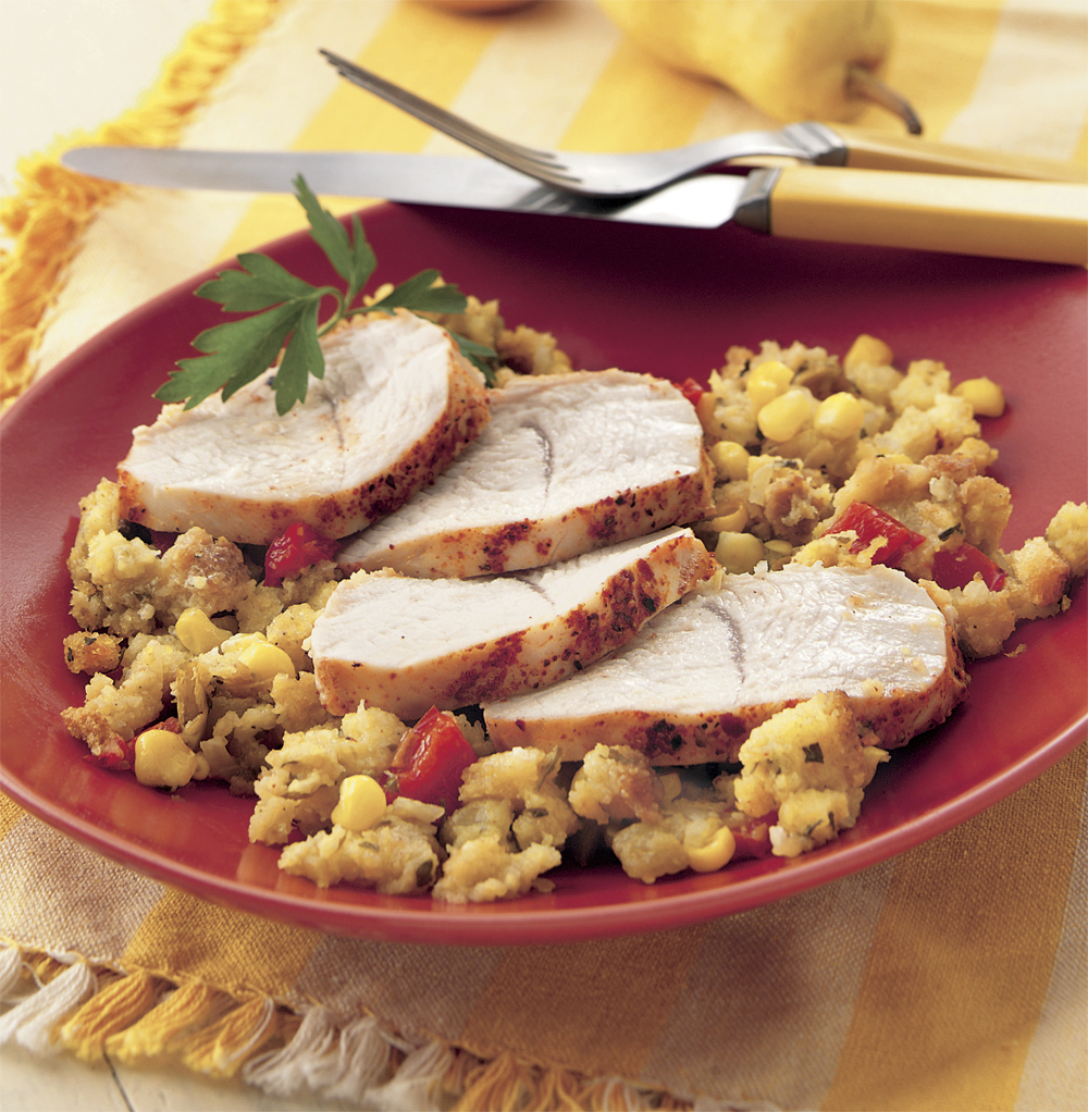 - Sprinkle both sides of turkey tenderloins with chili powder and peppered seasoned salt. Place tenderloins on stuffing mixture, pressing slightly into mixture.