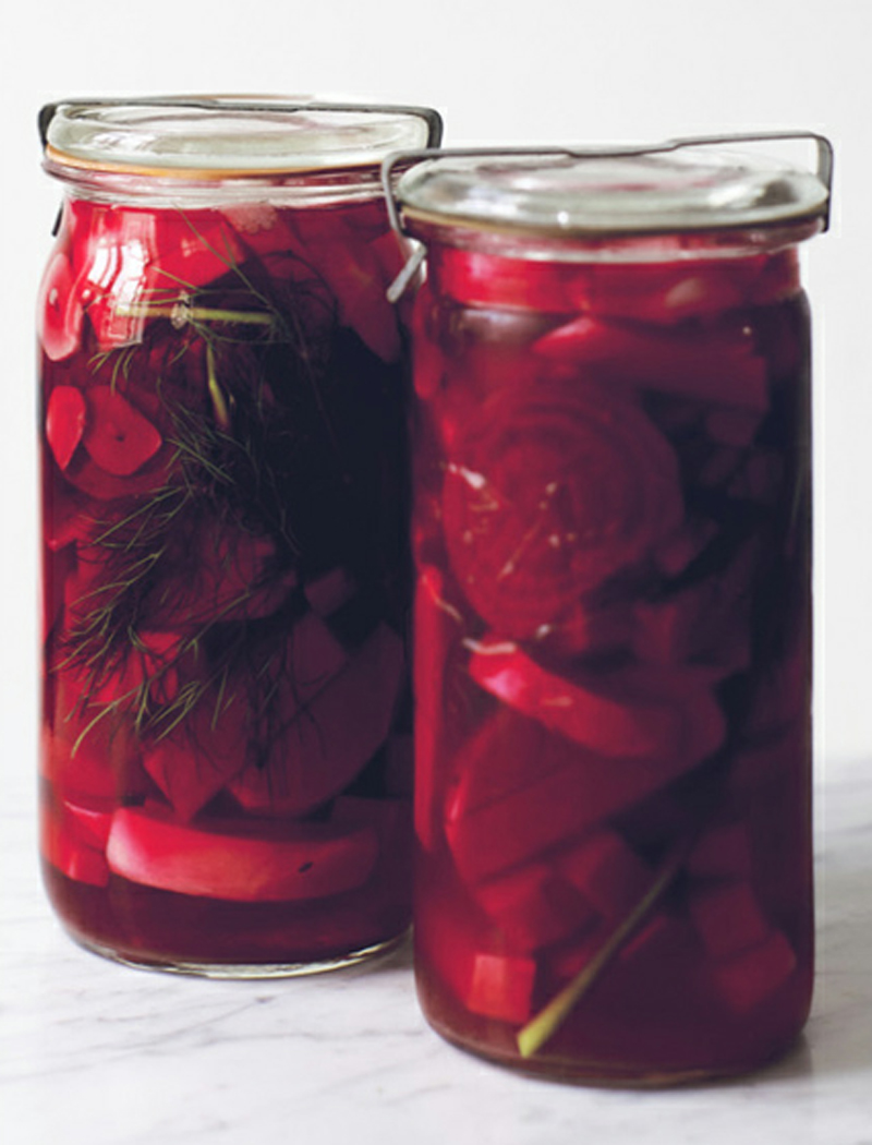 - Put a few slices of garlic in a 1-quart/1-liter jar, and add the dill sprigs. Toss a handful of turnip batons into the jar, followed by a couple of beet batons and then a few more slices of garlic. Continue layering the turnips, beets, and garlic until you have filled the jar.